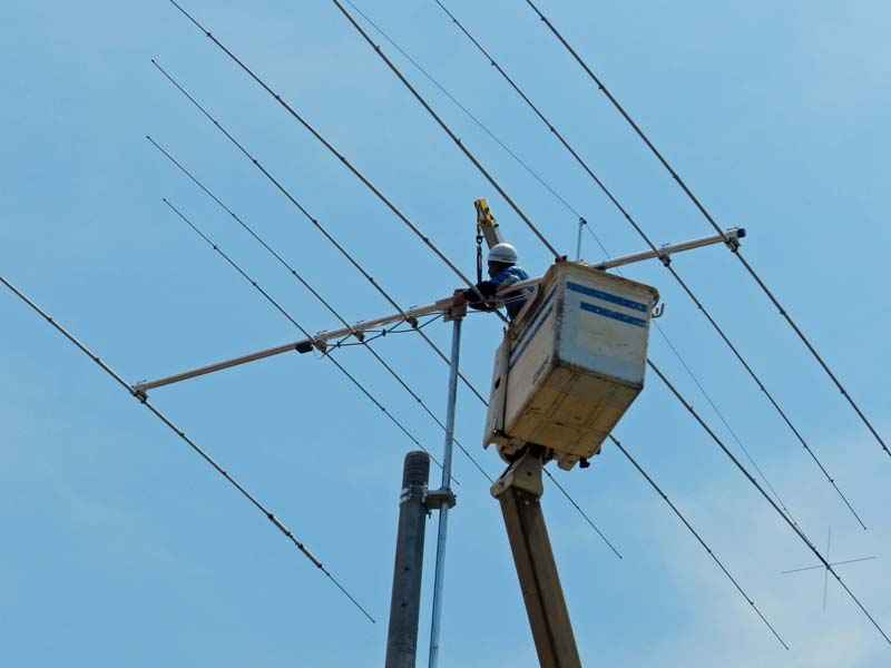 我が家は海を臨む高台の別荘地域です。 高い鉄塔を立てるのは地域の方が好まれません。 鉄塔を立てるのは止め、コンクリート柱で更新しました。 上に乗せるアンテナはダイポールではバランスが取れません。 やはり八木アンテナでしょう。