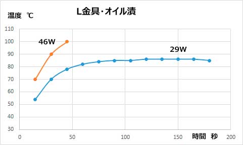 オイルの温度は40℃にもなっていないのに、46Wで100℃になるのが45秒でした。 この終端抵抗は使用最高温度が100℃なので、ここでテストを中断。 オイル漬の場合、終端抵抗は使用温度が200℃以上の物でないとオイルとの対流伝熱での冷却は効率が悪いですね。 この抵抗はオイル漬で使うと30W未満の能力しかありません。