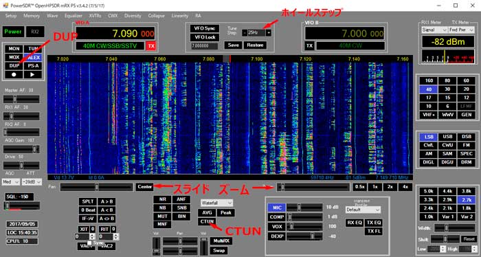panadapterまたはwaterfall画面でマウスの左ボタンをクリックしたままドラッグすると画面が左右に移動し、画面のセンターにある赤いライン(チューニング周波数)にQSYします。 マウスを使ったSDRらしいチューニング方法です。 画面を左右にうごかすので素早くQSY出来るのですが、CW、SSBなどはドラッグだけでゼロインするのは難しいと感じました。 大まかにQSYして、上記のホイールでチューニングをすると、ゼロインが容易です。 この組み合わせは使えそうです。